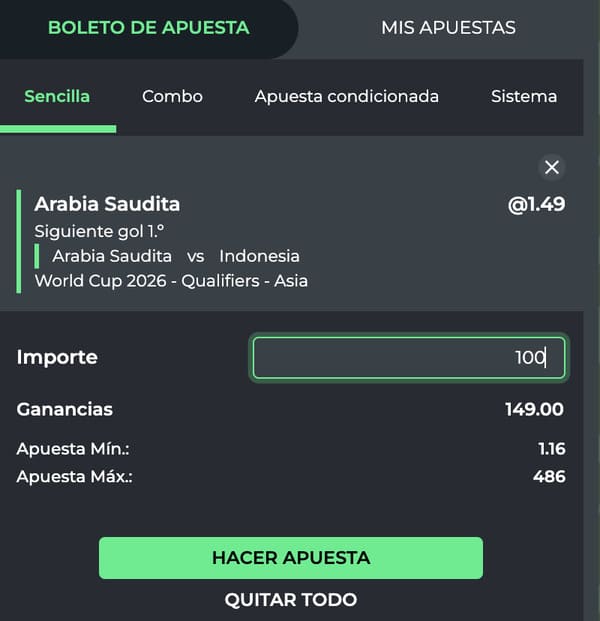 Desde la interfaz del evento, puedes ir armando tu apuesta con las mejores cuotas y mercados que creas convenientes. Estos mercados se van sumando hasta conseguir una apuesta combinada tan completa como la quieras realizar.