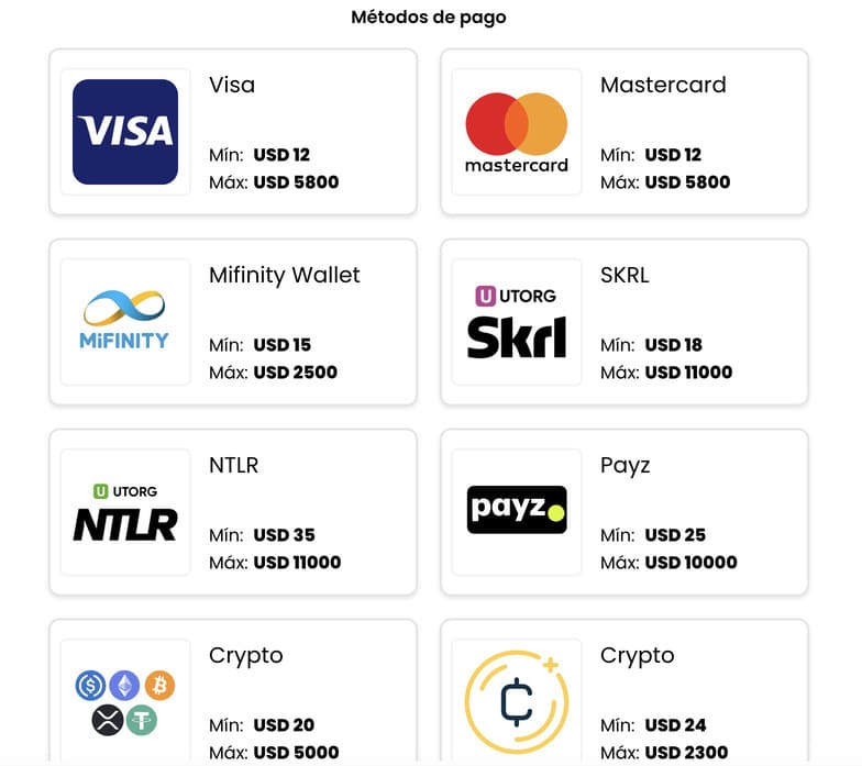 Los métodos más importantes que maneja están relacionados con tarjetas de crédito y una gran variedad de criptomonedas.